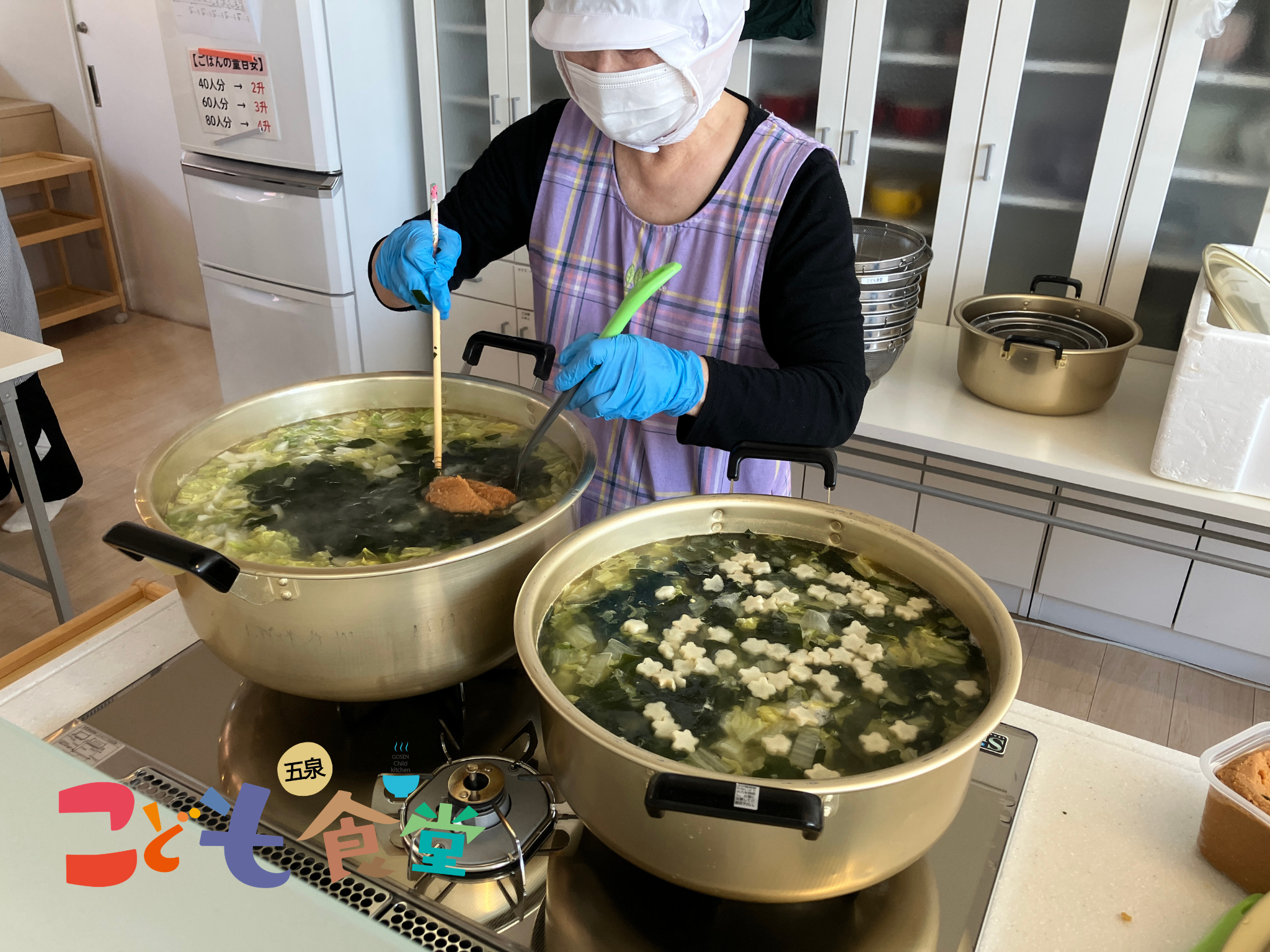 大きな鍋に、白菜・わかめ・ねぎ・麩を入れた具沢山みそ汁を作りました。おおよそ100人前です(*’▽’*)