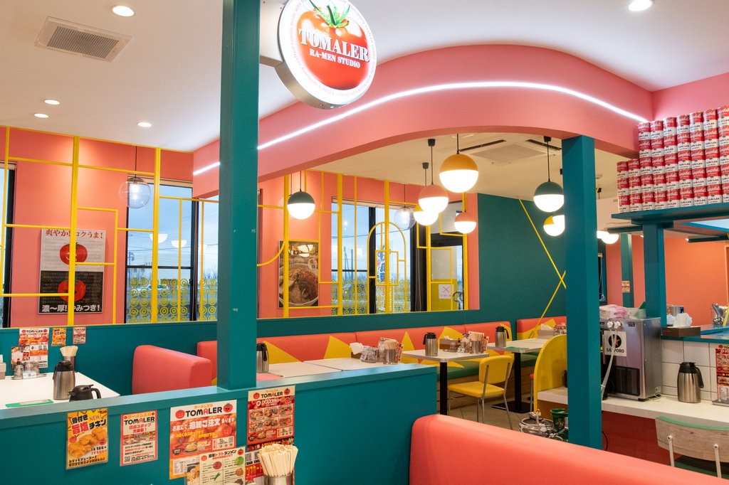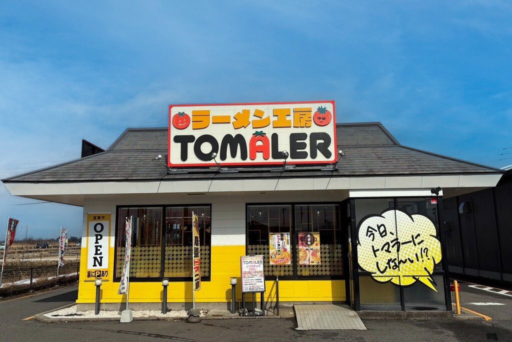 パッと目に飛び込んでくるイエローの建物に、トマトがポイントの大きな看板。国道403号線、北潟の交差点で一際目を惹くこのお店は、2024年12月にオープンした「ラーメン工房トマラー」です。その佇まいは、通るたびに気になってしまう存在感。